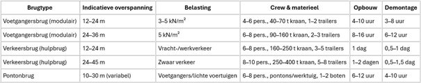 - Pontonbrug (watergang): opbouw 6–12 uur, demontage 4–10 uur.