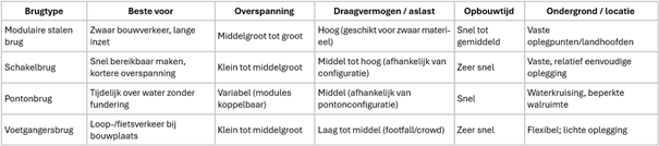 - Schakelbrug: snel te plaatsen, efficiënt bij korte tot middelgrote overspanningen.